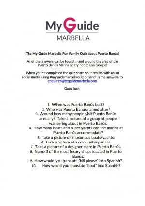 Denne gratis sjove familiequiz er den perfekte aktivitet at lave, hvis du har en time at slå ihjel i Puerto Banús. Alle svar på quizen kan findes ved at gå rundt i området Puerto Banús eller ved at spørge nogle af de lokale (prøv ikke at bruge google!).