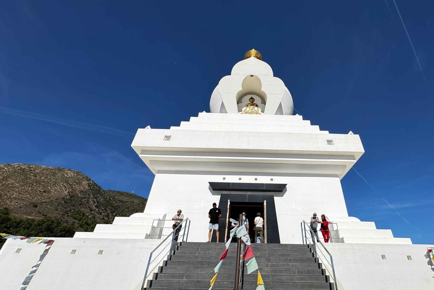 Empieza tu viaje con un traslado privado en Tesla de Málaga a Marbella. Haz una parada en el mirador de la Stupa de Benalmádena para hacer unas fotos panorámicas impresionantes de la costa mediterránea.